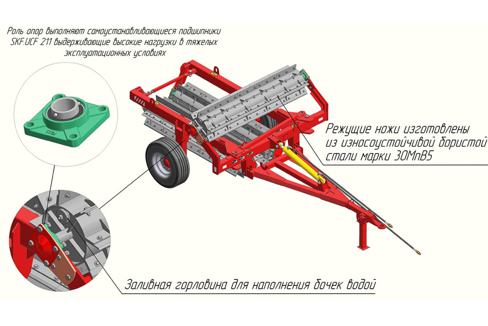 Ножи изготовлены из борсодержащей стали марки 30MnB5, что осуществляет самозаточку ножей. Для утяжеления катков, на торцах рабочих органов имеются пробки, для заполнения их водой. Рама катка изготовлена из профильной трубы 150х100х8мм. Рама катка и установленные на ней пластины, изготовлены из высокопрочной конструкционной стали марки 09Г2С. На катках установлены самоустанавливающие импортные подшипники марки FKL 210, что является самым надежным подшипником, применяемым для данной серии узлов аналогичных агрегатов.