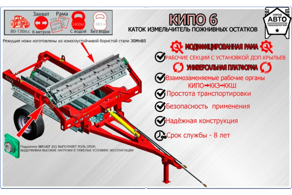 Данный каток позволяет измельчить послеуборочные остатки растений, среди них остатки: кукурузы; подсолнуха; валки соломы; Разрешенная транспортная ширина катка, позволяет безопасно транспортировать его по дорогам общего пользования. Измельчитель пожнивных остатков Завода Автотехнологий станет отличным инструментом на вашем сельскохозяйственном производстве. У нас Вы можете приобрести не только технику по разумной цене, но и комплектующие европейских производителей.